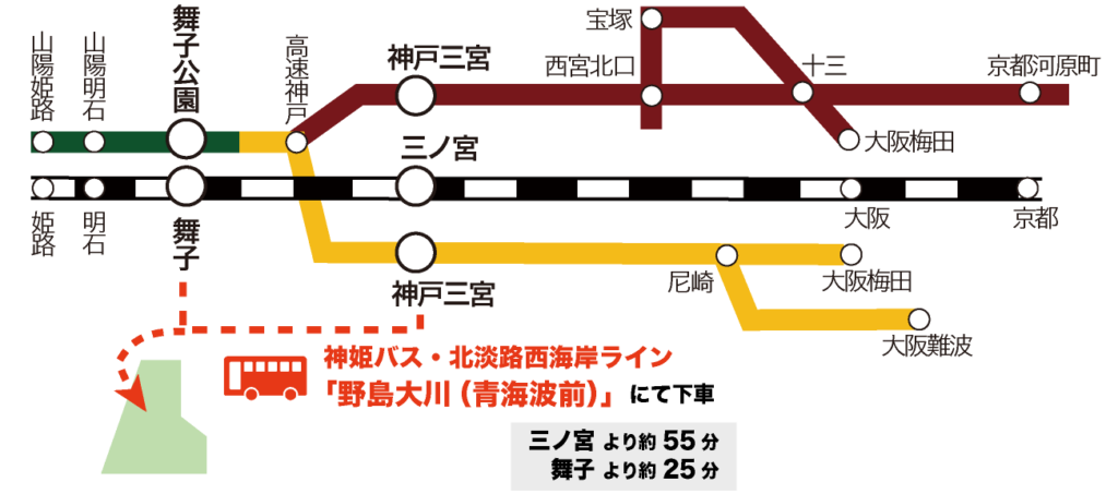 (各線三ノ宮駅より約55分、JR舞子駅より約25分)